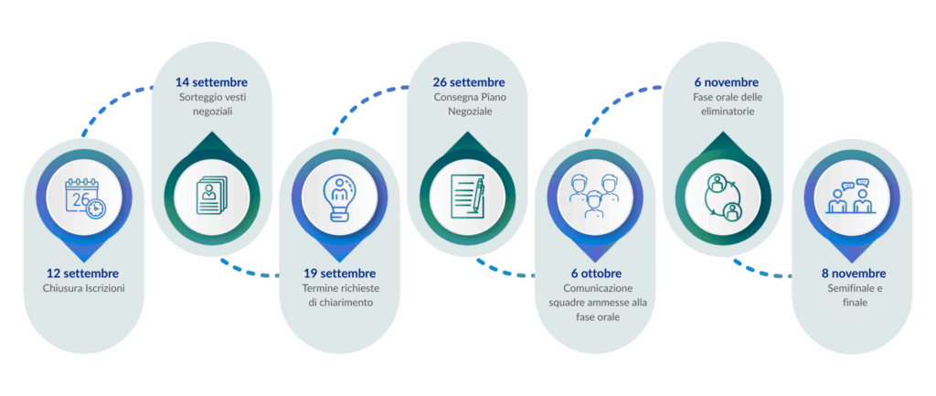 Le squadre avranno così la possibilità di calarsi nei panni degli avvocati di parte e di negoziare sulla base del caso fittizio al fine di addivenire ad un accordo.