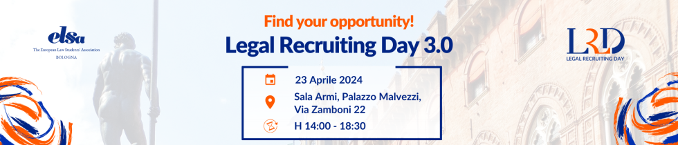 Dopo il successo delle precedenti edizioni, ELSA Bologna torna anche quest’anno con il suo Career Fair: il Legal Recruiting Day 3.0 (LRD)!