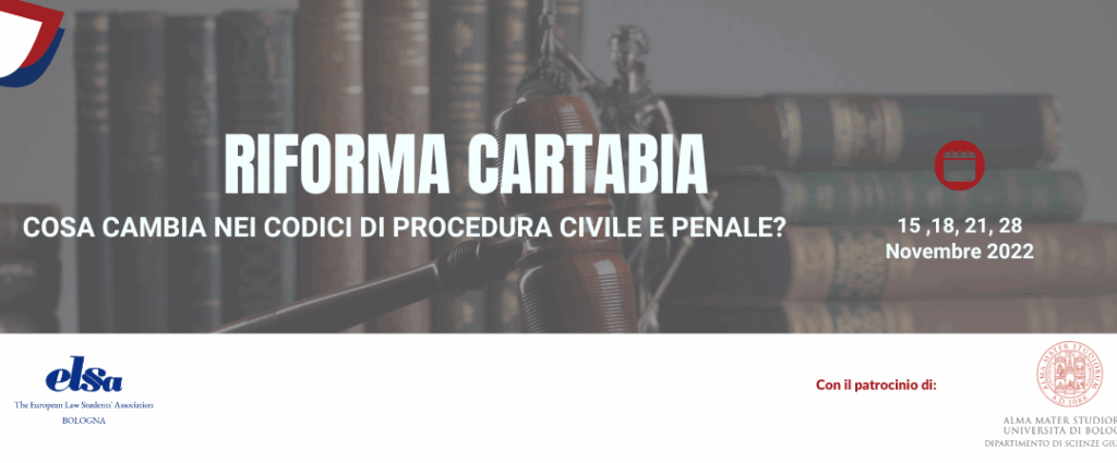 ELSA Bologna è lieta di presentarvi il ciclo di conferenze dedicate alla importanza della riforma dei codici di procedura civile e penale, che prende il nome dalla giurista italiana, Marta Cartabia, che è stata Presidente della Corte costituzionale (11 dicembre 2019 –13 settembre 2020) e Ministro della Giustizia (13 febbraio 2021 – 22 ottobre 2022).