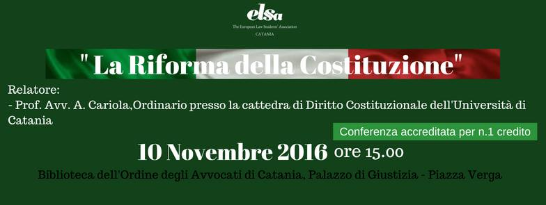 Convinti che per votare consapevolmente bisogna avere consapevolezza, ELSA Catania è lieta di invitarvi alla lectio magistralis dal titolo “La Riforma della Costituzione”, dove si focalizzarà l’attenzione sulla rifoma della seconda parte della Costituzione pubblicata nella G.U. del 15 aprile 2016, n°88.