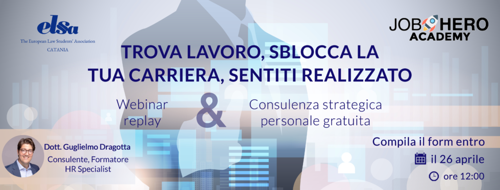 E’ con grande piacere che ELSA Catania, in virtù della Partnership con la JobHeroAcademy, Vi informa dell’opportunità offerta dal nostro Partner di accedere al Webinar Replay “Trova lavoro, sblocca la tua carriera, sentiti realizzato”, con la possibilità altresì di richiedere una consulenza strategica personale e gratuita di 40 minuti.