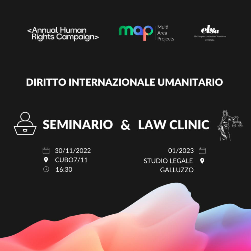 Il Multi-Area Project avrà inizio il 30 novembre, con il seminario che si svolgerà presso l’Università della Calabria al cubo 7/11, alle ore 16:30, ed è rivolto sia ai soci di ELSA Cosenza che a chiunque sia interessato ad approfondire la tematica del diritto internazionale umanitario e la protezione del minore in fuga da un conflitto armato.
