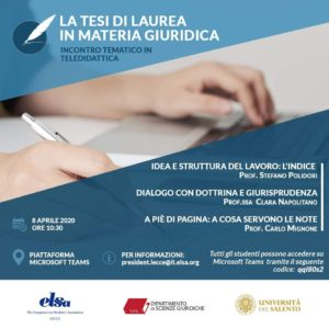 ELSA Lecce è lieta di presentare la II Edizione del Corso “La Tesi di Laurea in materia giuridica” che si terrà il prossimo 8 aprile 2020 alle ore 10:30 su Microsoft Teams.