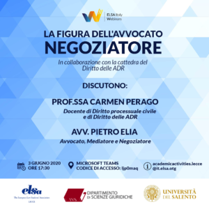 ELSA Lecce è lieta di invitarvi all’evento “La figura dell’avvocato negoziatore” che si terrà mercoledì 3 giugno 2020, alle ore 17:30 sulla piattaforma Microsoft Teams.