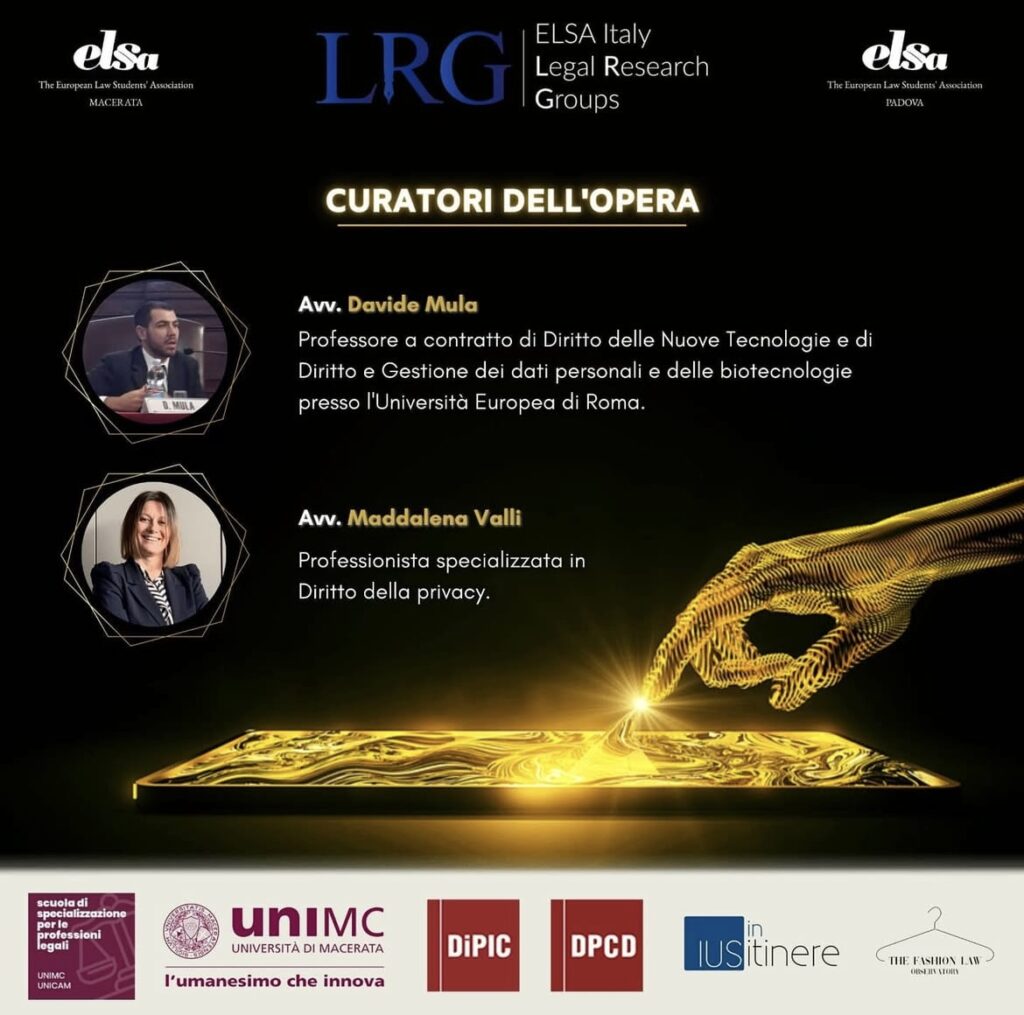 ELSA Macerata ed ELSA Padova hanno deciso di organizzare in sinergia LRG, il Legal Research Group, dandogli un taglio originale ed innovativo, attraverso la proposta di un argomento particolarmente in voga nell’era attuale del Digitale. Con tale progetto le sezioni di ELSA Macerata e ELSA Padova si propongono di offrire ai soci di tutti i local boards presenti in Italia la possibilità di svolgere attività di indagine ed analisi di argomenti attuali in molteplici rami del diritto e di renderne noti i relativi risultati alla comunità scientifica.