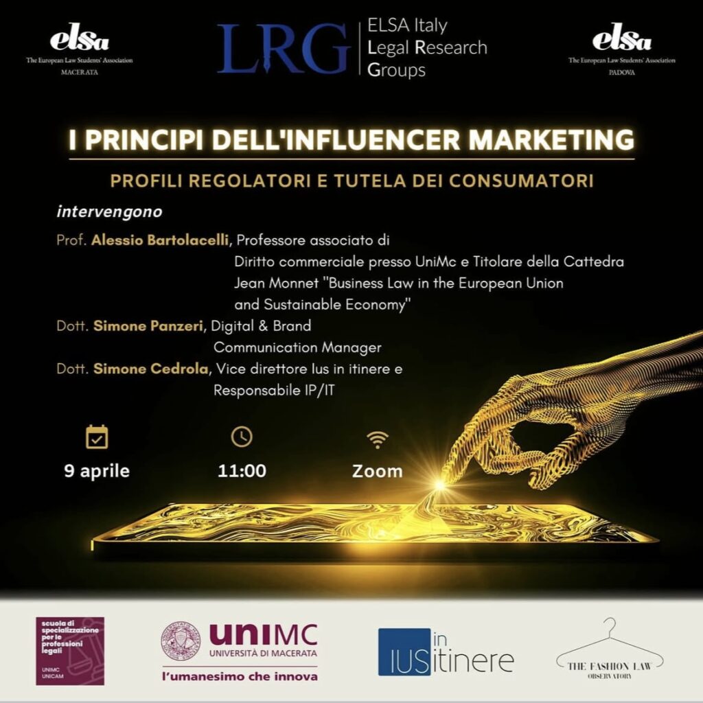 Il Legal Research Group organizzato da ELSA Macerata ed ELSA Padova si focalizzerà sul tema dell’Influencer Marketing, un tema innovativo e originale. La scelta del tema, infatti, è stata dettata dalla volontà di avvicinare i soci ad una disciplina sempre più attuale grazie alla diffusione dei social media, ma difficilmente affrontata all’interno dei corsi universitari. Al fine di fornire agli interessati gli strumenti adeguati alla comprensione di questa particolare branca del diritto, infatti, in collaborazione con l’Area di Seminari e Conferenze, sono stati organizzati tre webinar di presentazione del tema.