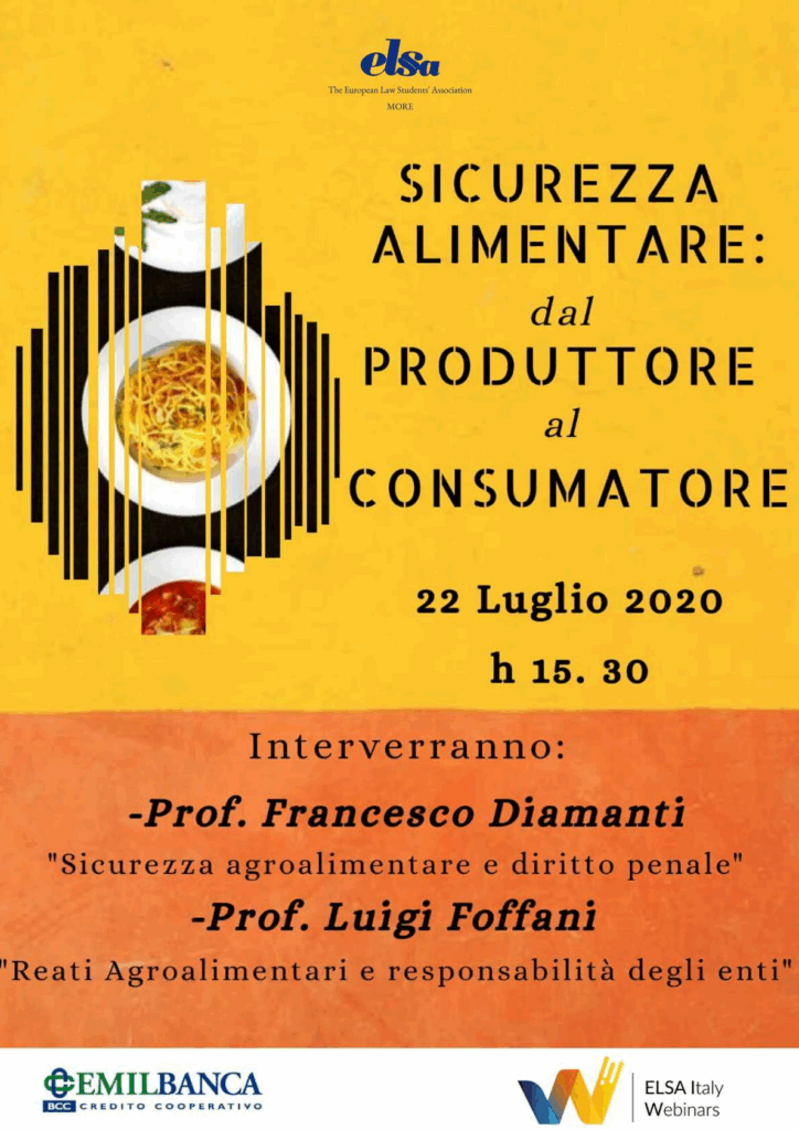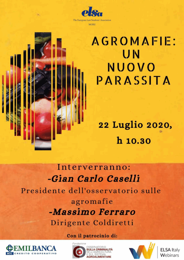 ELSA MORE, da sempre sensibile alla tematica del diritto alimentare, in alternativa alla Summer Law School on Food Law, ha deciso di organizzare un ciclo di webinar per affrontare temi caldi come le Agromafie, la Sicurezza Agroalimentare e il mondo del BIO.