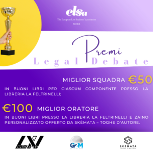Miglior Oratore: 100€ in buoni libri presso la libreria La Feltrinelli e zaino personalizzato offerto da Skémata – Toghe d’Autore.