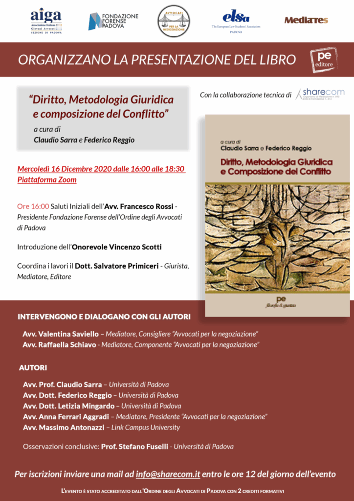 L’incontro è organizzato da Associazione Avvocati per la Negoziazione e Fondazione Forense di Padova con la collaborazione tecnica di Sharecom e il patrocinio di ELSA Padova, AIGA Padova e la rivista Mediares.