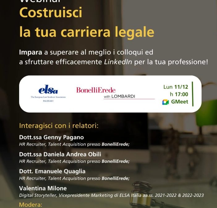 ELSA Palermo è stata lieta di ospitare su Google Meet i membri delle Risorse Umane di Bonelli Erede e la Dott.ssa Valentina Milone all’evento “Costruisci la tua carriera legale!”