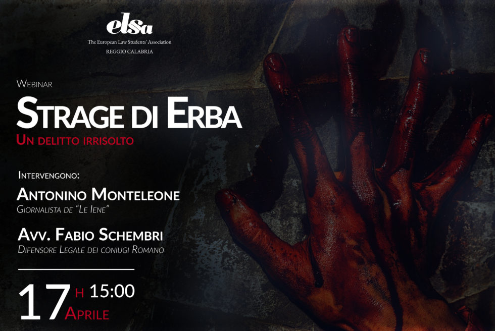 ELSA Reggio Calabria è orgogliosa di invitarVi al Webinar, dal titolo “Strage di Erba – Un delitto irrisolto”, che si svolgerà in modalità online, su piattaforma Zoom, venerdì 17 aprile 2020 dalle ore 15:00 alle ore 17:00.