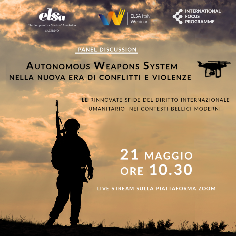 Siamo lieti di invitarvi alla Panel Discussion, dal titolo “Autonomous Weapons System nella nuova era di conflitti e violenze. Le rinnovate sfide del diritto internazionale umanitario nei contesti bellici moderni” che si terrà giovedì 21 maggio a partire dalle ore 10.30 sulla piattaforma webinar di ELSA Italia.