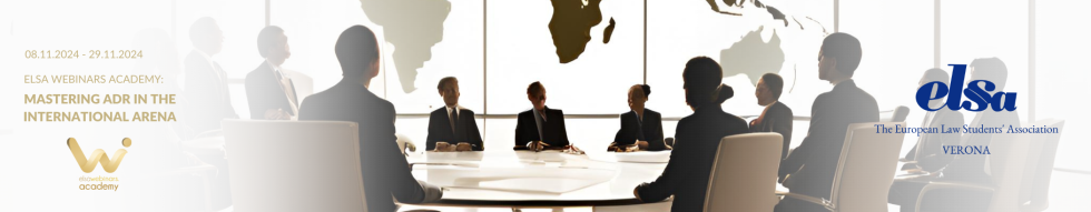 ELSA Verona è entusiasta di presentare l’ELSA Webinars Academy dal titolo Mastering ADR in the International Arena, un ciclo di cinque lezioni dedicato a chiunque voglia approfondire le coinvolgenti dinamiche della Risoluzione Alternativa delle Controversie (ADR) a livello internazionale.